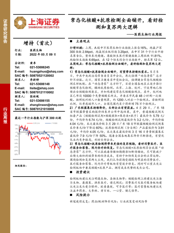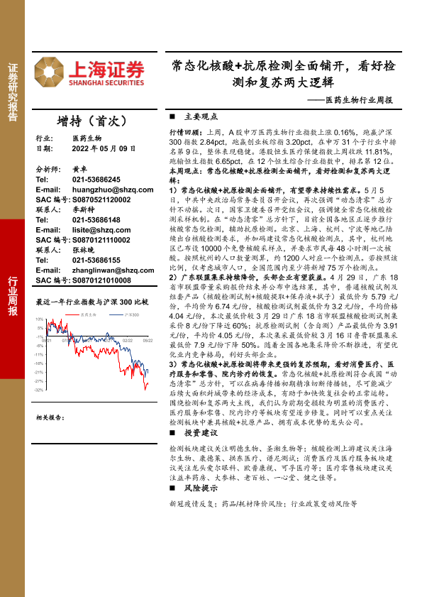 【上海证券】【20220509】医药生物行业周报:常态化核酸+抗原检测全面铺开,看好检测和复苏两大逻辑-25页