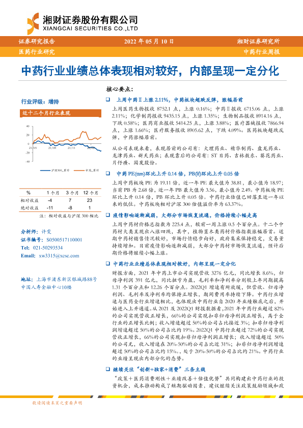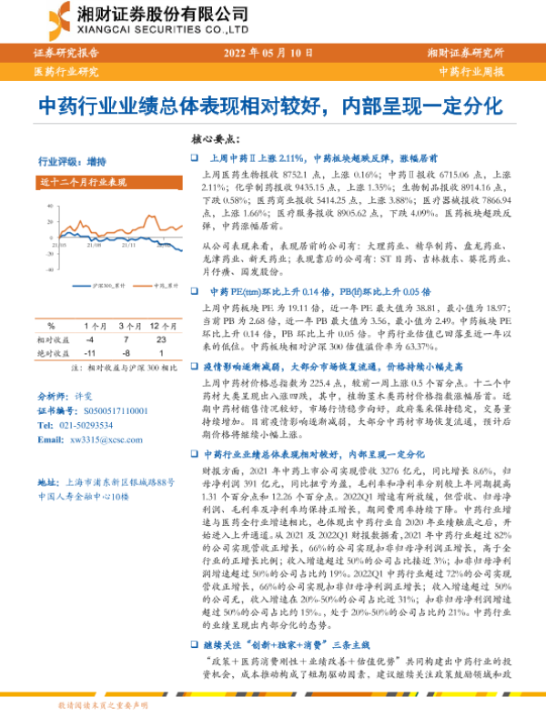 【湘财证券】【20220510】中药行业周报:中药行业业绩总体表现相对较好,内部呈现一定分化-12页