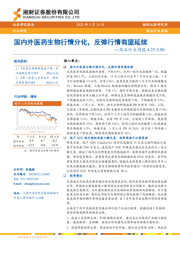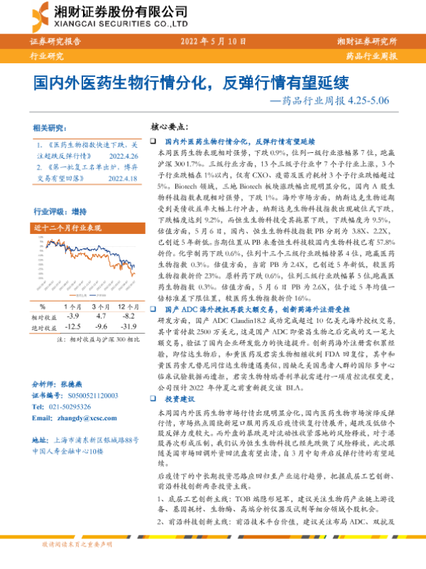 【湘财证券】【20220510】药品行业周报:国内外医药生物行情分化,反弹行情有望延续-14页