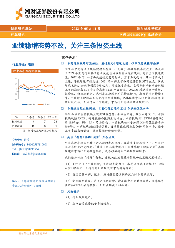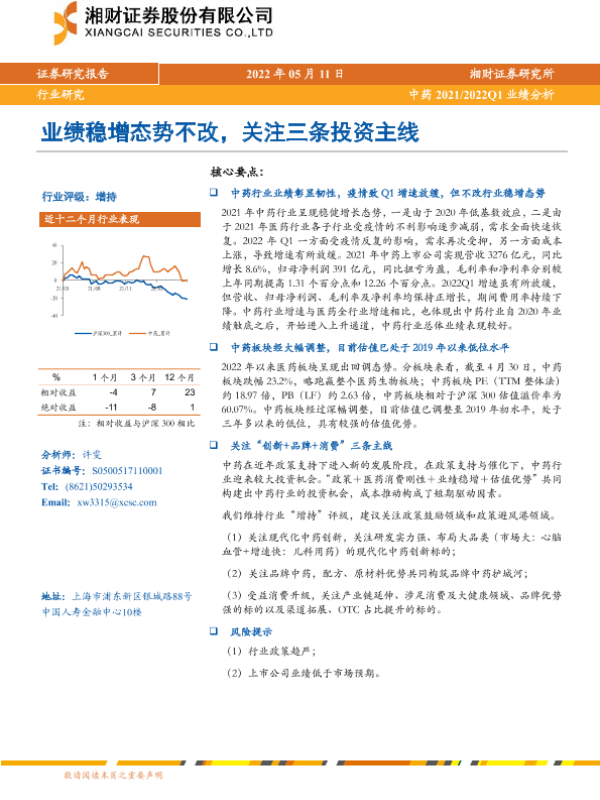【湘财证券】【20220511】中药2021 2022Q1业绩分析:业绩稳增态势不改,关注三条投资主线-22页