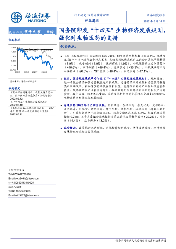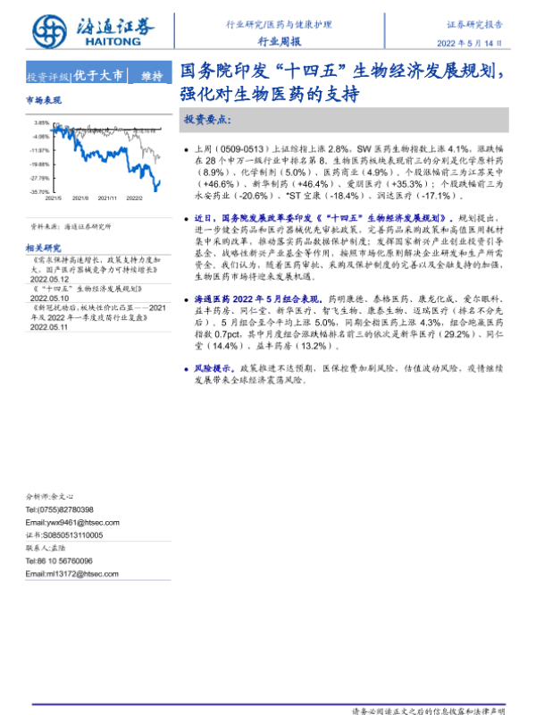 【海通证券】【20220514】医药与健康护理行业周报:国务院印发“十四五”生物经济发展规划,强化对生物医药的支持-6页