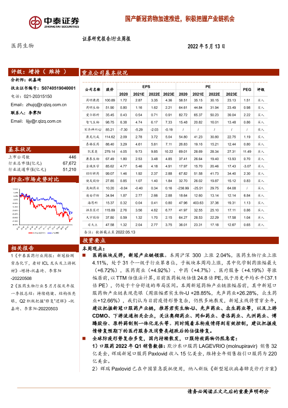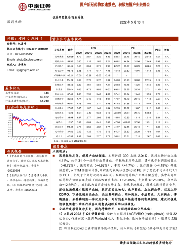 【中泰证券】【20220513】医药生物行业周报:国产新冠药物加速推进,积极把握产业链机会-11页