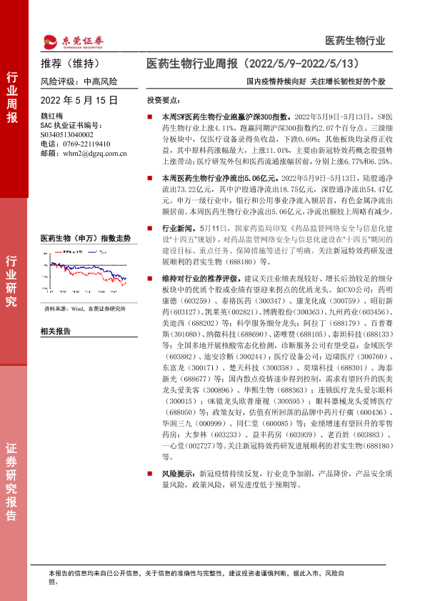 【东莞证券】【20220515】医药生物行业周报:国内疫情持续向好 关注增长韧性好的个股-10页