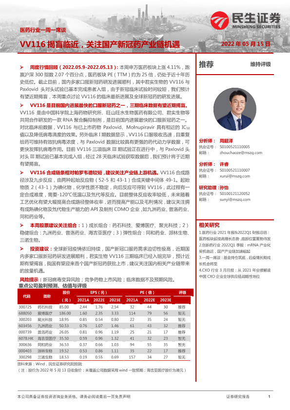 【民生证券】【20220515】医药行业一周一席谈:VV116揭盲临近,关注国产新冠药产业链机遇-17页