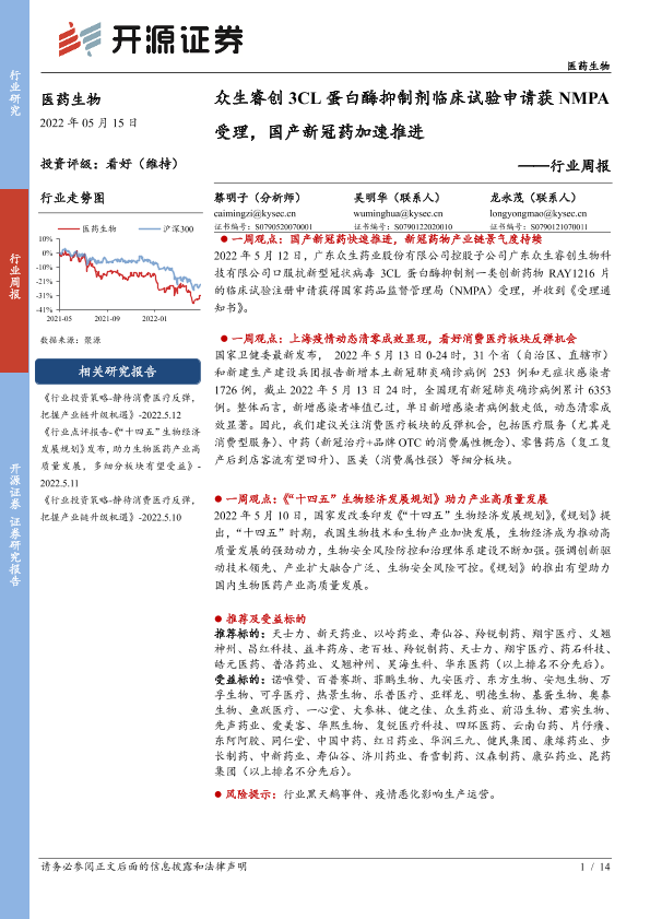 【开源证券】【20220515】医药生物行业周报:众生睿创3CL蛋白酶抑制剂临床试验申请获NMPA受理,国产新冠药加速推进-14页