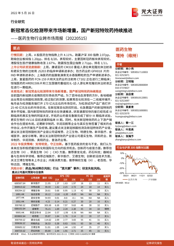 【光大证券】【20220516】医药生物行业跨市场周报:新冠常态化检测带来市场新增量,国产新冠特效药持续推进-23页