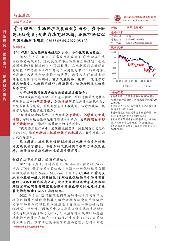【东亚前海证券】【20220516】'十四五'生物经济发展规划出台,多个医药板块受益;创新疗法突破不断,提振市场信心-13页