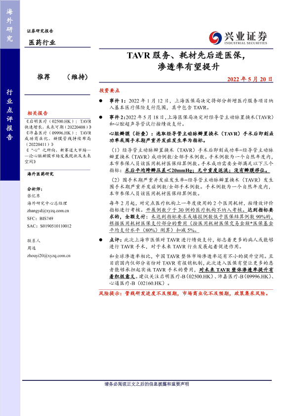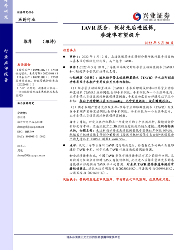 【兴业证券】【20220520】TAVR服务、耗材先后进医保,渗透率有望提升-5页