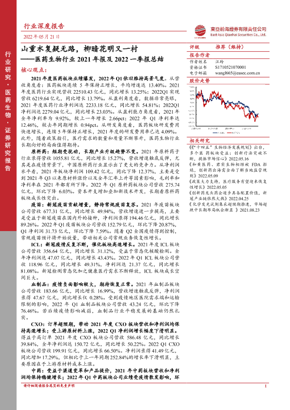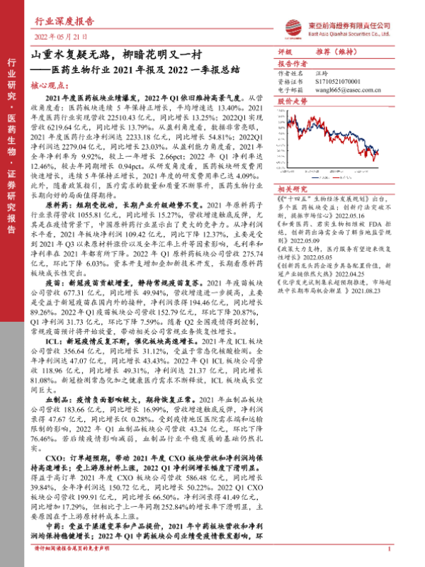 【东亚前海证券】【20220521】医药生物行业2021年报及2022一季报总结-23页