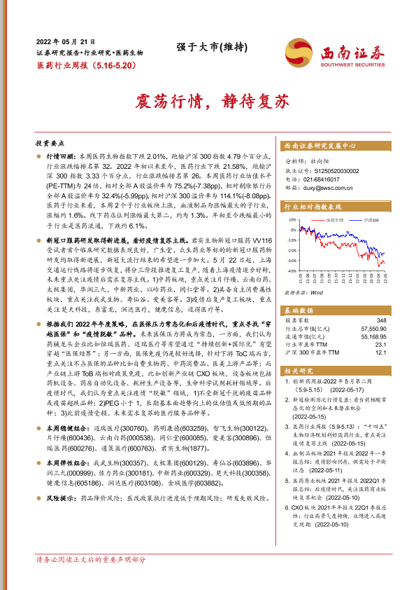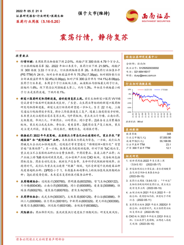【西南证券】【20220521】医药行业周报:震荡行情,静待复苏-40页