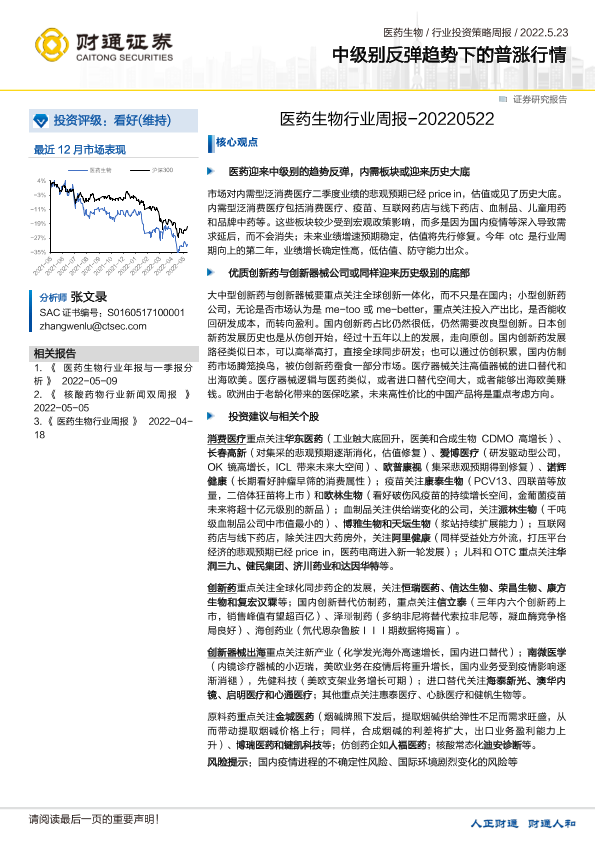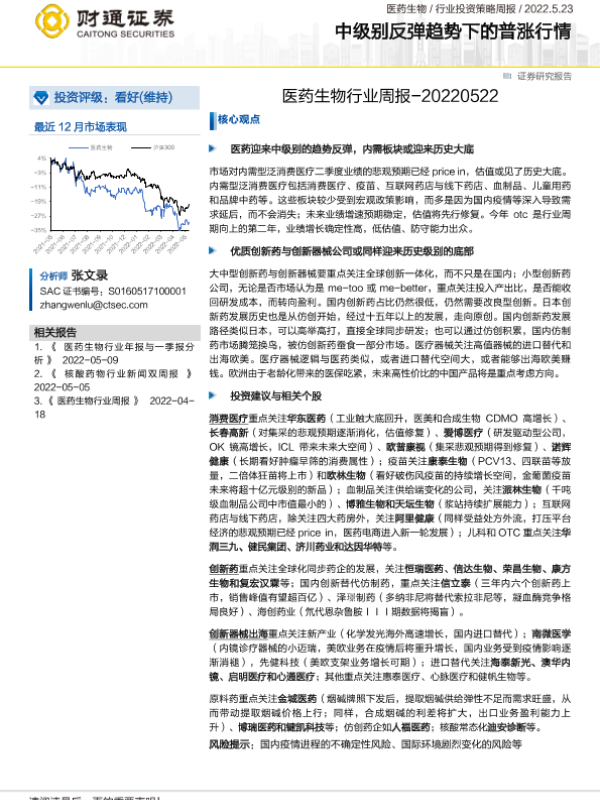 【财通证券】【20220523】医药生物行业周报:中级别反弹趋势下的普涨行情-11页