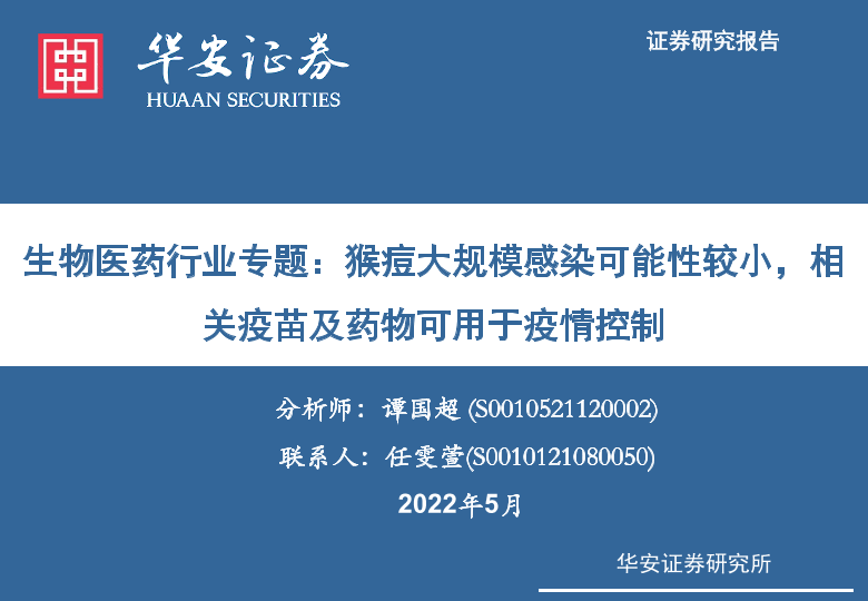【华安证券】【20220524】生物医药行业专题:猴痘大规模感染可能性较小,相关疫苗及药物可用于疫情控制-15页