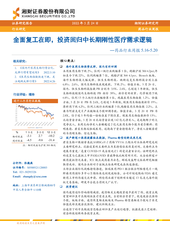 【湘财证券】【20220524】药品行业周报:全面复工在即,投资回归中长期刚性医疗需求逻辑-16页