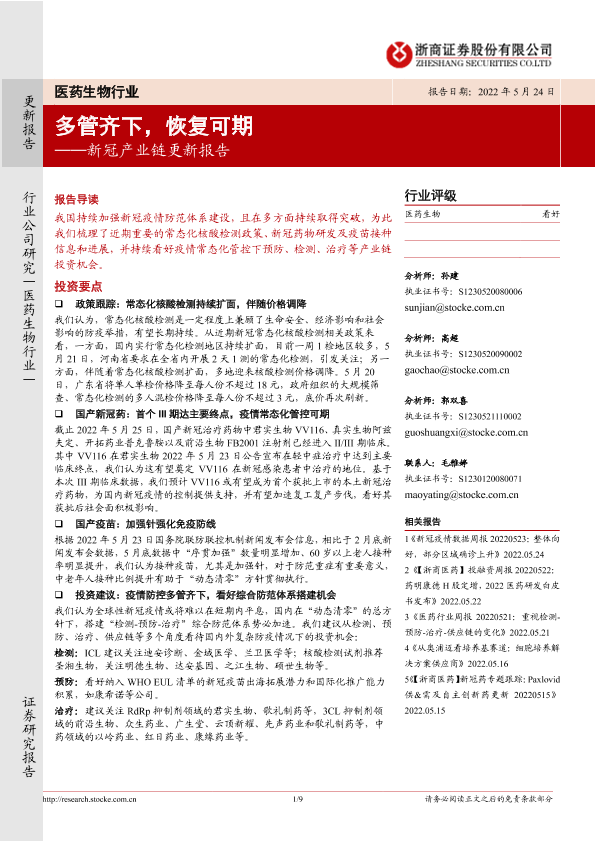 【浙商证券】【20220524】医药生物行业新冠产业链更新报告:多管齐下,恢复可期-9页