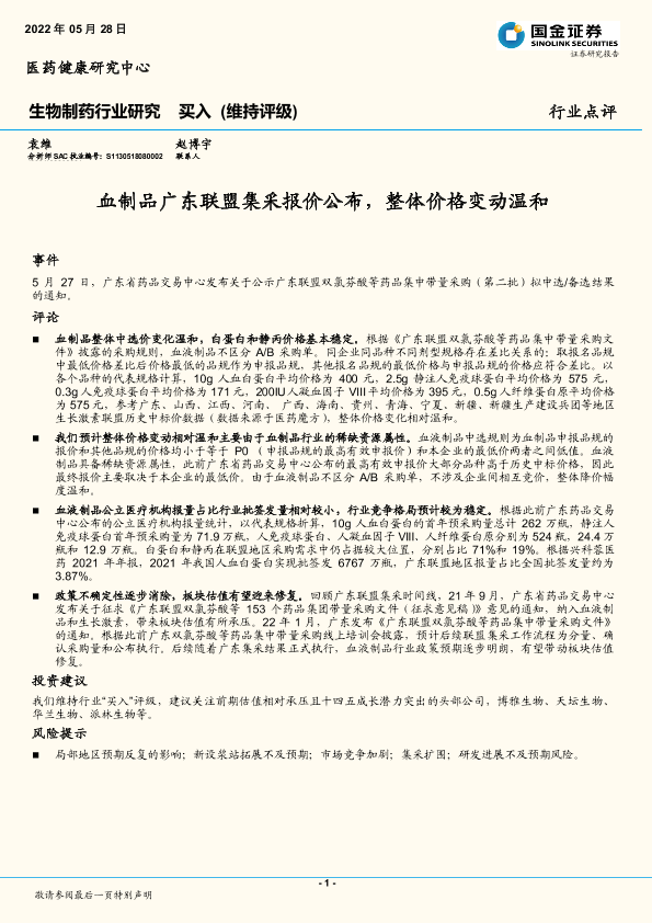 【国金证券】【20220528】血制品广东联盟集采报价公布,整体价格变动温和-3页