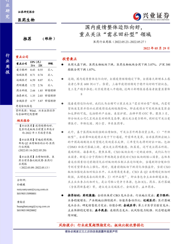 【兴业证券】【20220529】国内疫情整体边际向好,重点关注“需求回补型”领域-13页