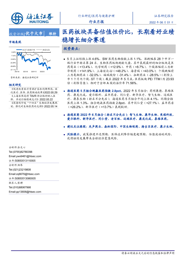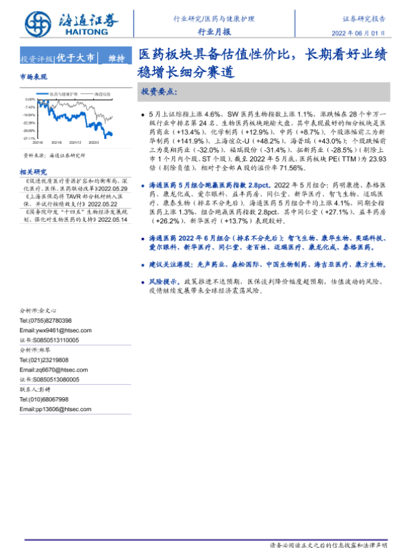【海通证券】【20220601】医药与健康护理行业月报:医药板块具备估值性价比,长期看好业绩稳增长细分赛道-5页