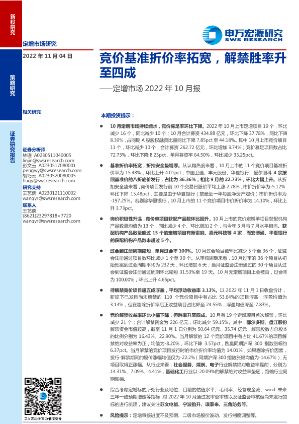 【申万宏源】【20221104】定增市场2022年10月报:竞价基准折价率拓宽,解禁胜率升至四成-18页