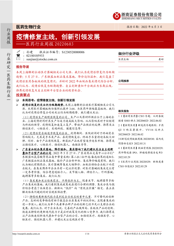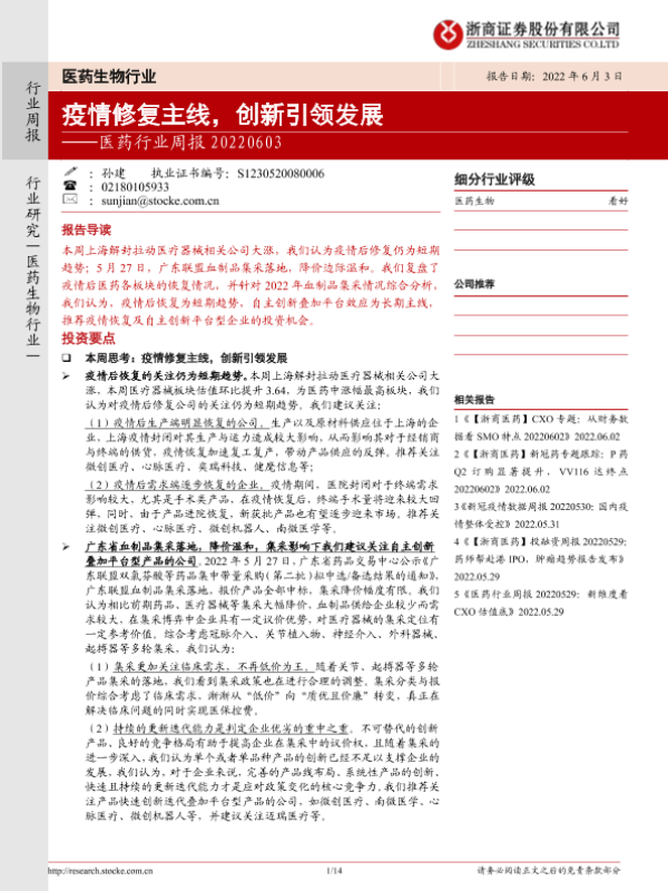 【浙商证券】【20220603】医药行业周报:疫情修复主线,创新引领发展-14页