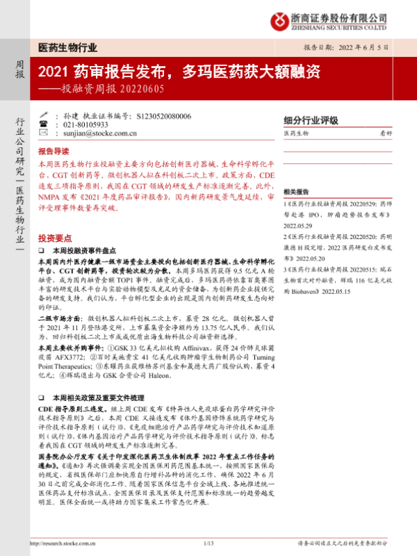 【浙商证券】【20220605】医药生物行业投融资周报:2021药审报告发布,多玛医药获大额融资-13页