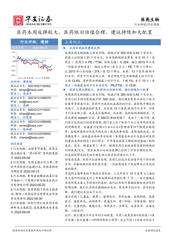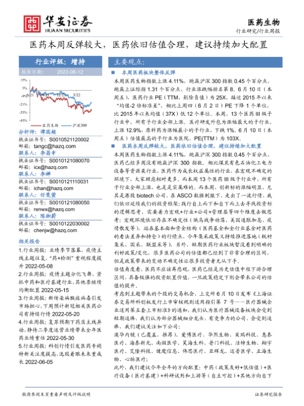 【华安证券】【20220612】医药生物行业周报:医药本周反弹较大,医药依旧估值合理,建议持续加大配置-20页