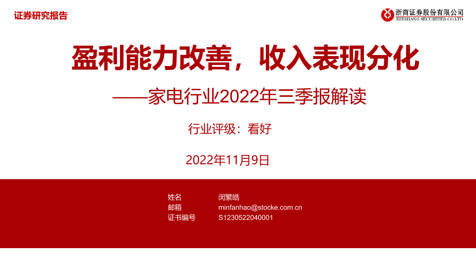 【浙商证券】【20221109】家电行业2022年三季报解读:盈利能力改善,收入表现分化-41页