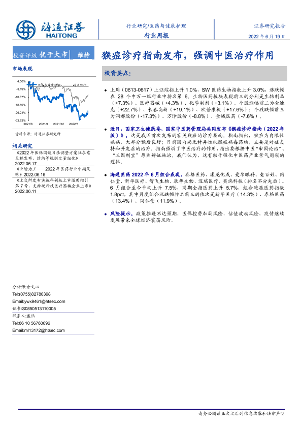 【海通证券】【20220619】医药与健康护理行业周报:猴痘诊疗指南发布,强调中医治疗作用-6页