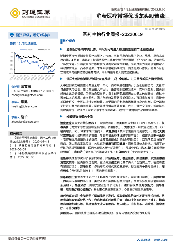 【财通证券】【20220620】医药生物行业周报:消费医疗带领优质龙头股普涨-8页