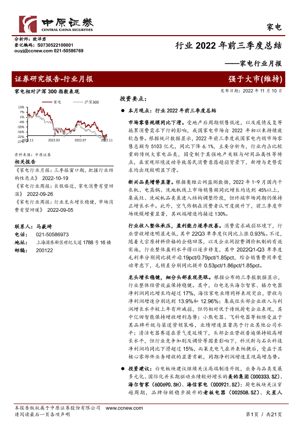 【中原证券】【20221110】家电行业月报:行业2022年前三季度总结-21页