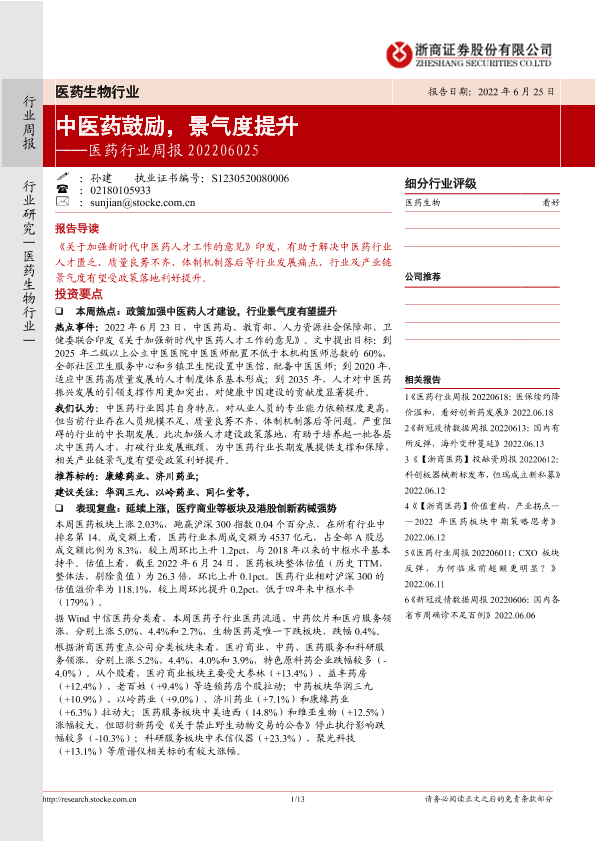 【浙商证券】【20220625】医药行业周报:中医药鼓励,景气度提升-13页
