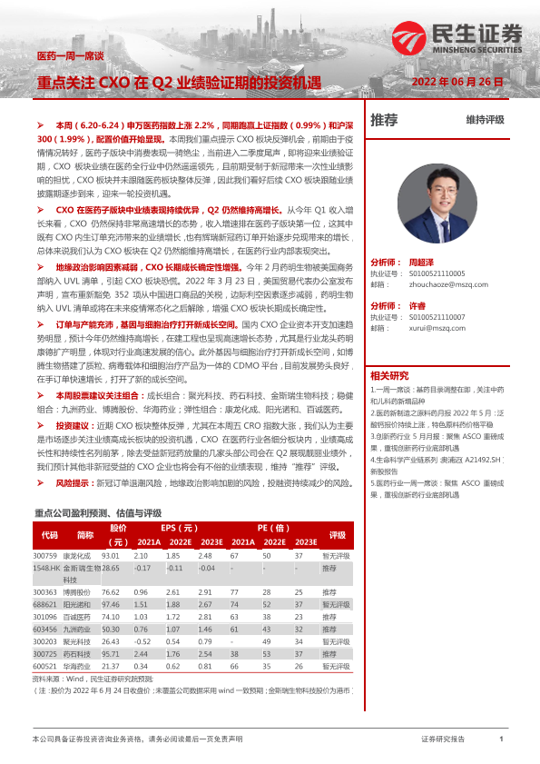 【民生证券】【20220626】医药一周一席谈:重点关注CXO在Q2业绩验证期的投资机遇-11页