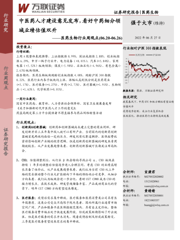 【万联证券】【20220627】中医药人才建设意见发布,看好中药细分领域业绩估值双升-8页