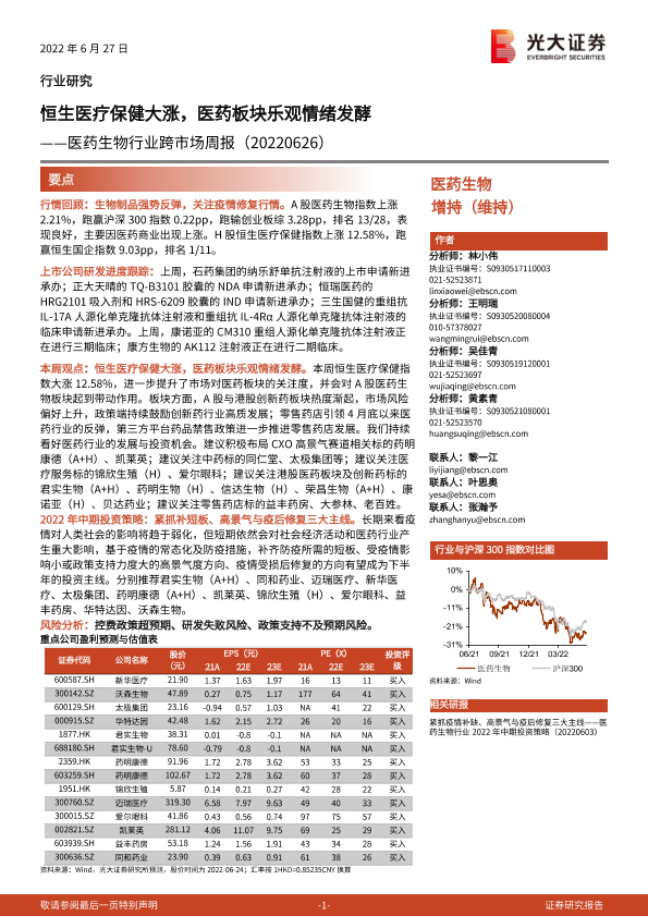 【光大证券】【20220627】医药生物行业跨市场周报:恒生医疗保健大涨,医药板块乐观情绪发酵-27页