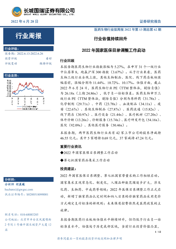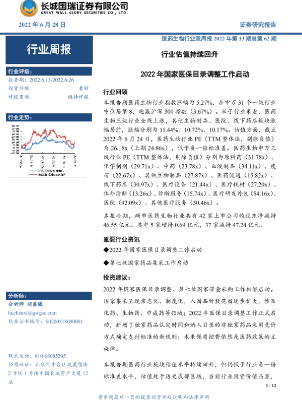 【长城国瑞证券】【20220628】医药生物行业双周报2022年第13期总第62期:行业估值持续回升 2022年国家医保目录调整工作启动-12页