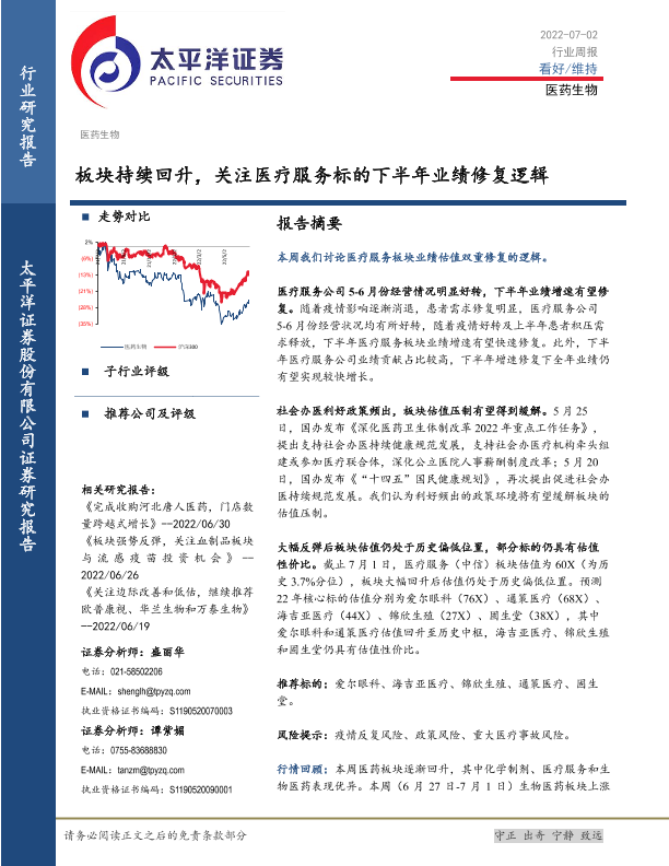 【太平洋证券】【20220702】医药生物行业周报:板块持续回升,关注医疗服务标的下半年业绩修复逻辑-16页