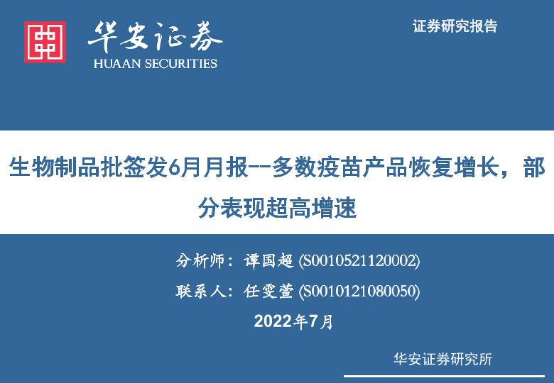 【华安证券】【202207】生物制品批签发6月月报:多数疫苗产品恢复增长,部分表现超高增速-18页