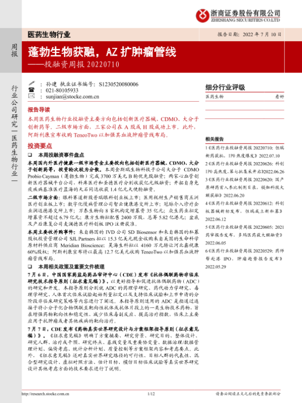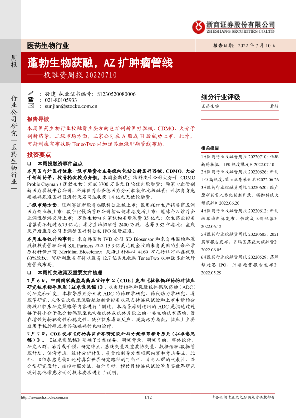 【浙商证券】【20220710】医药生物行业投融资周报:蓬勃生物获融,AZ扩肿瘤管线-12页