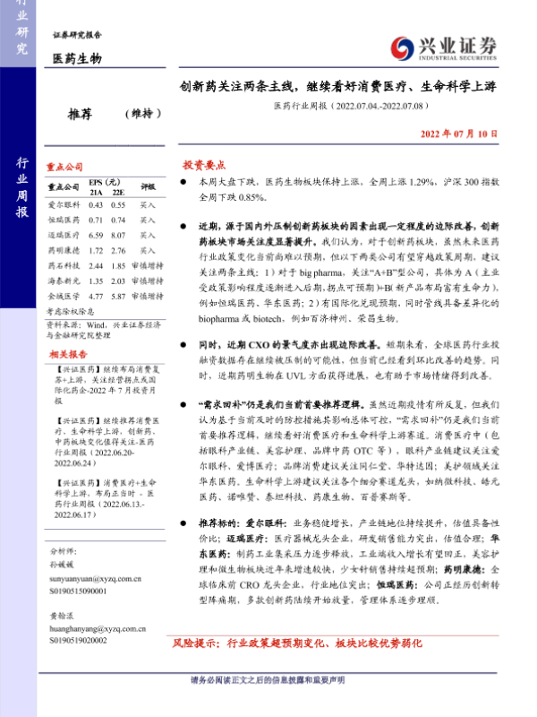 【兴业证券】【20220710】医药行业周报:创新药关注两条主线,继续看好消费医疗、生命科学上游-12页
