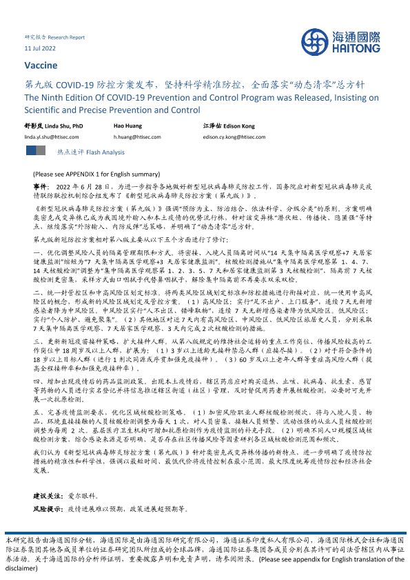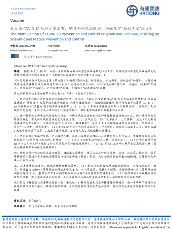 【海通国际】【20220711】第九版COVID-19防控方案发布,坚持科学精准防控,全面落实“动态清零”总方针-10页