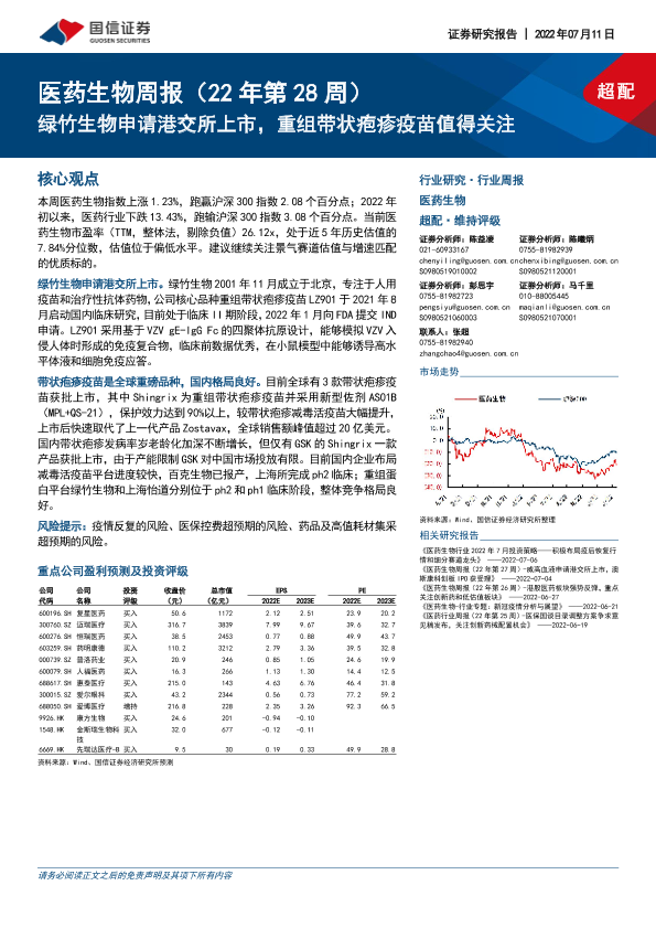 【国信证券】【20220711】医药生物周报:绿竹生物申请港交所上市,重组带状疱疹疫苗值得关注-15页