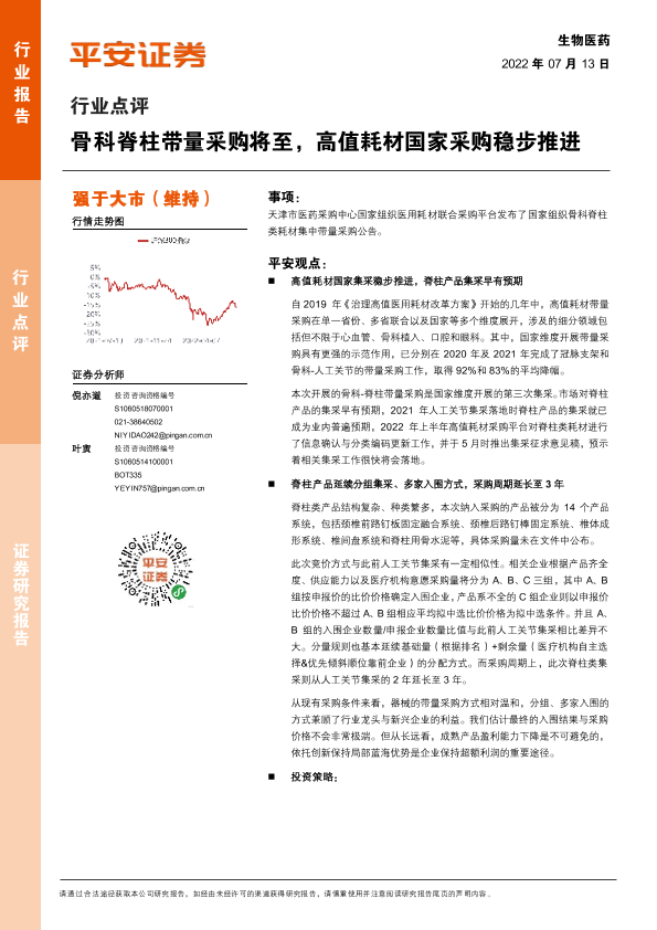 【平安证券】【20220713】生物医药行业点评:骨科脊柱带量采购将至,高值耗材国家采购稳步推进-3页