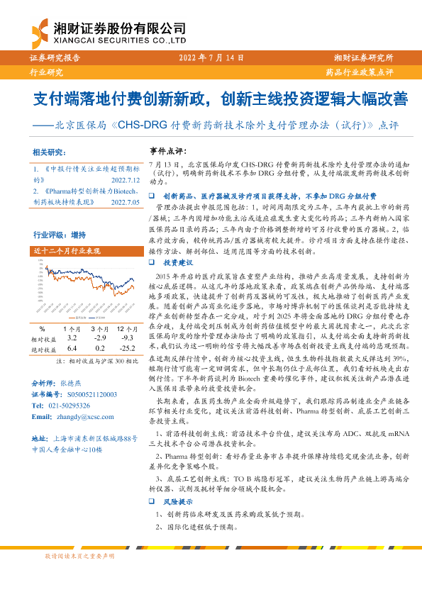 【湘财证券】【20220714】药品行业政策点评:北京医保局《CHS-DRG付费新药新技术除外支付管理办法(试行)》点评-2页