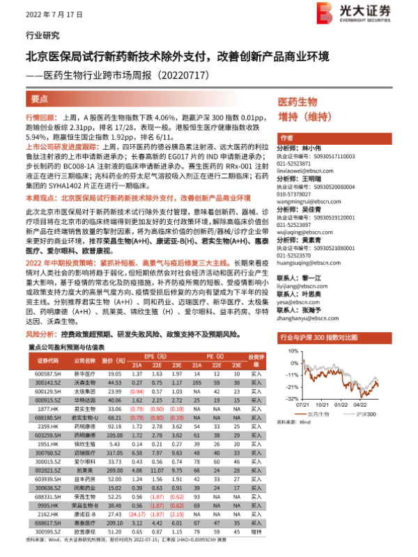 【光大证券】【20220717】医药生物行业跨市场周报:北京医保局试行新药新技术除外支付,改善创新产品商业环境-24页