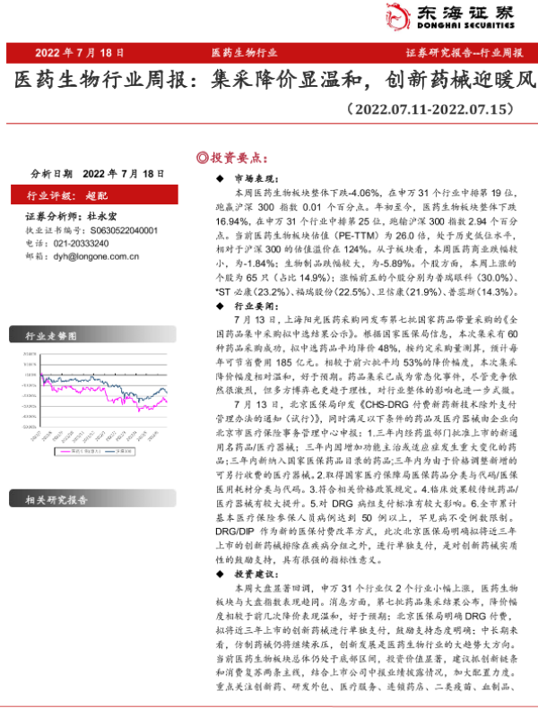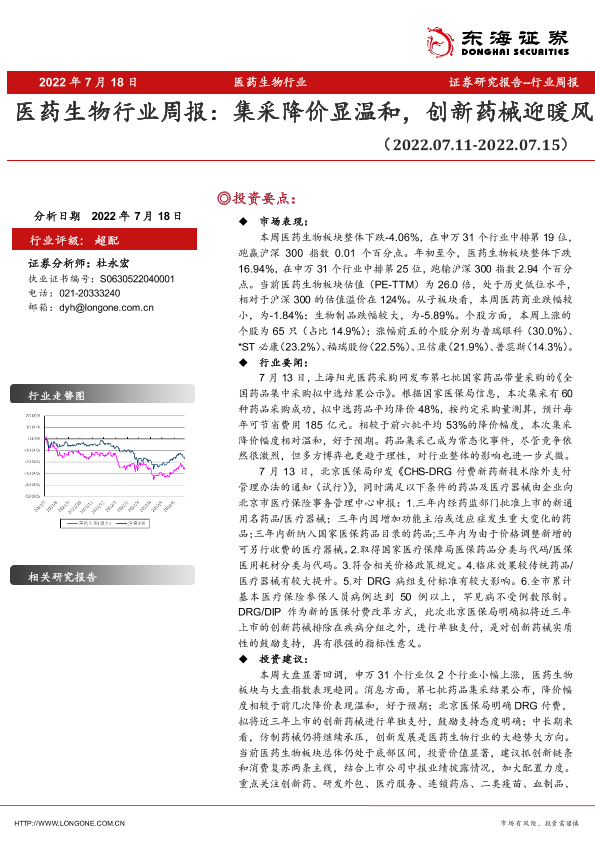 【东海证券】【20220718】医药生物行业周报:集采降价显温和,创新药械迎暖风-10页