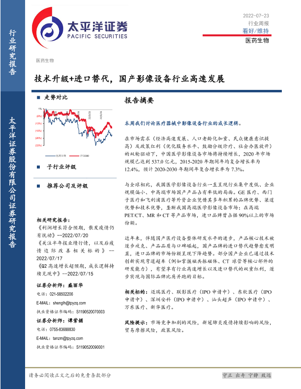 【太平洋证券】【20220723】医药生物行业周报:技术升级+进口替代,国产影像设备行业高速发展-22页