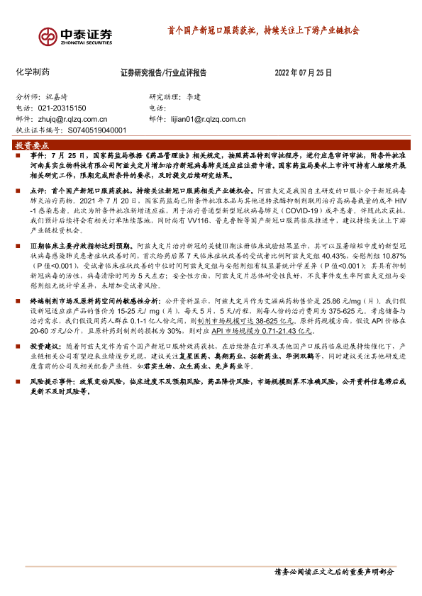 【中泰证券】【20220725】化学制药行业点评报告:首个国产新冠口服药获批,持续关注上下游产业链机会-3页