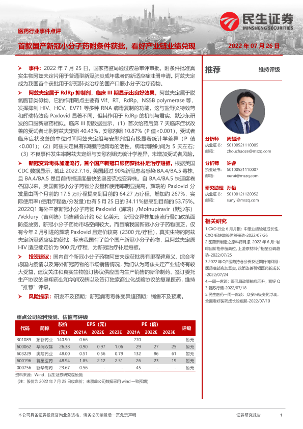 【民生证券】【20220726】首款国产新冠小分子药附条件获批,看好产业链业绩兑现-2页