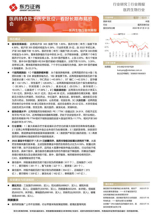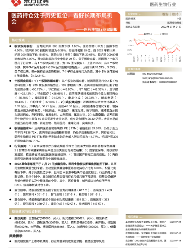 【东方证券】【20220731】医药生物行业双周报:医药持仓处于历史低位,看好长期布局机会-14页