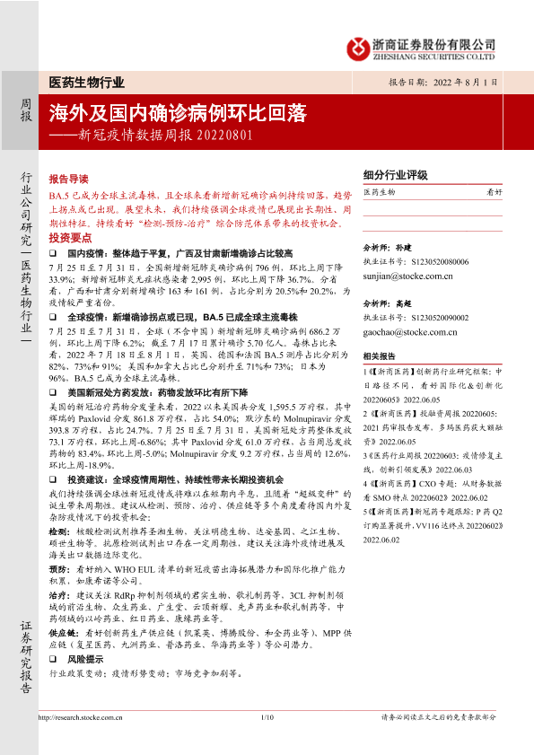 【浙商证券】【20220801】医药生物行业新冠疫情数据周报:海外及国内确诊病例环比回落-10页