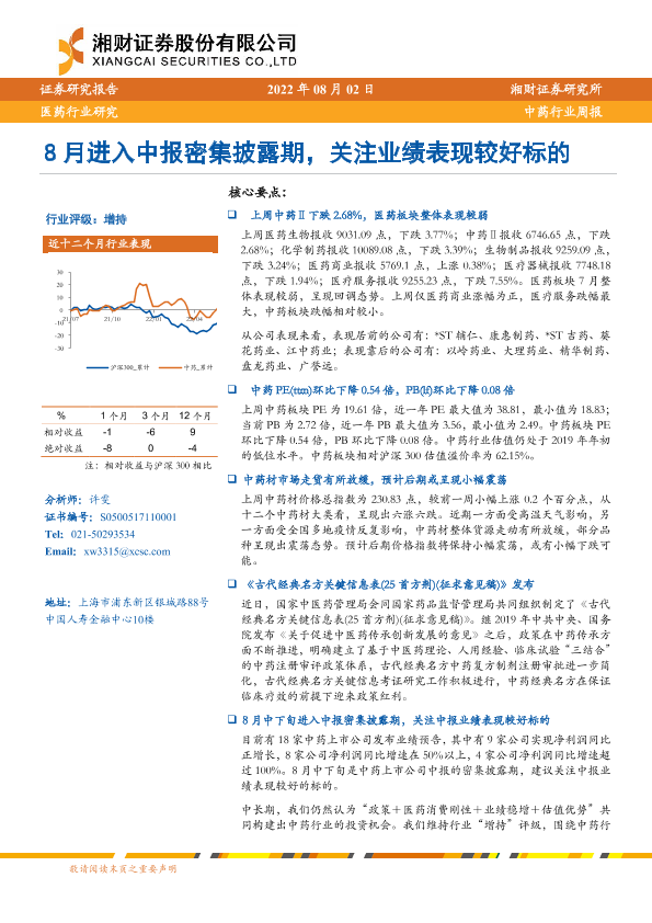 业绩表现 中报披露 中药行业 估值分析 政策支持